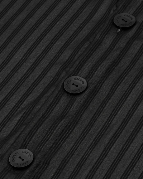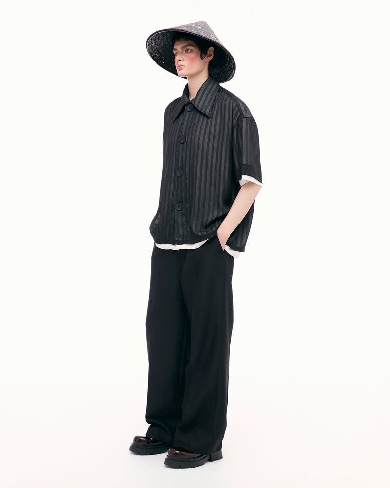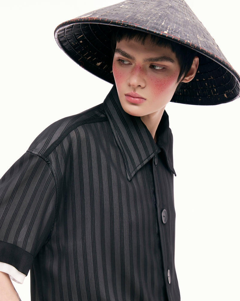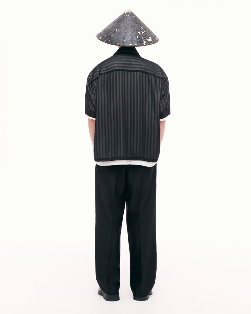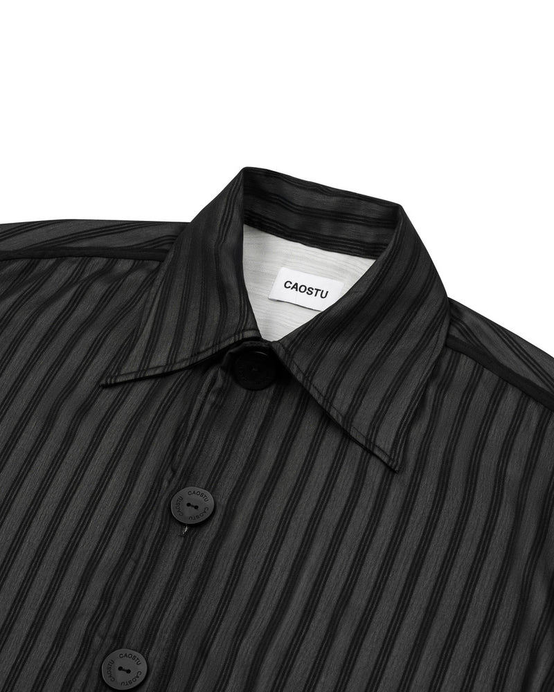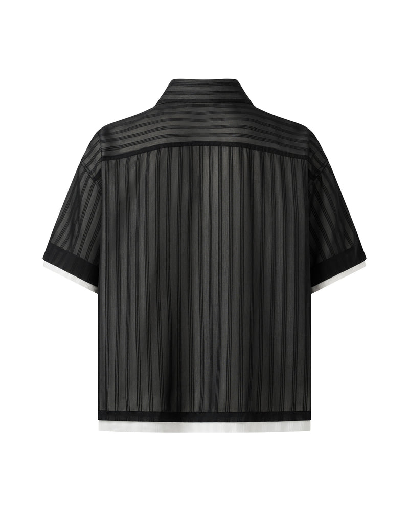 A short-sleeve, loose-fit shirt made from breathable, sheer striped chiffon. It features two layers of contrasting fabric at the hem and sleeves to create a layered effect. The design includes an oversized collar and a row of signature large buttons.
