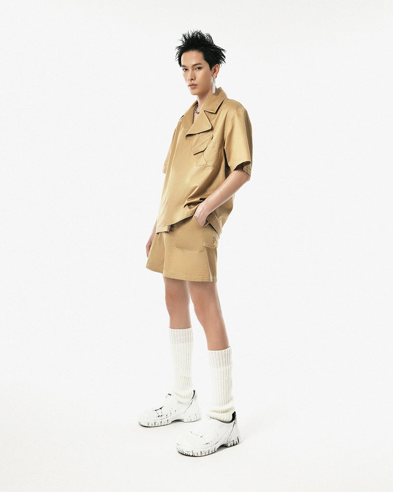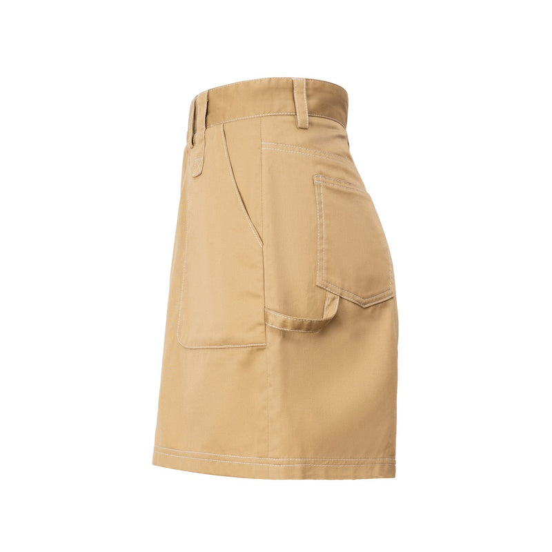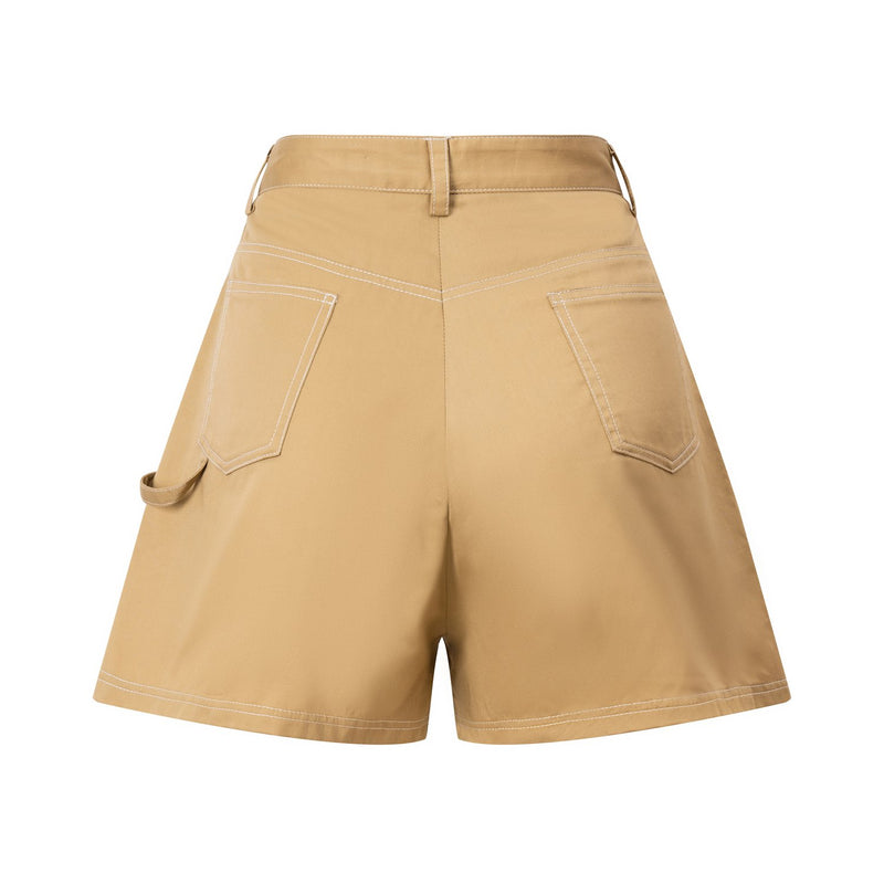 - Lightweight khaki camel-colored micro shorts with contrast top stitching.