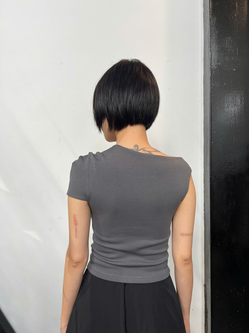 • Detail: flattering body-con tee with asymmetrical cut-out and shoulder epaulette