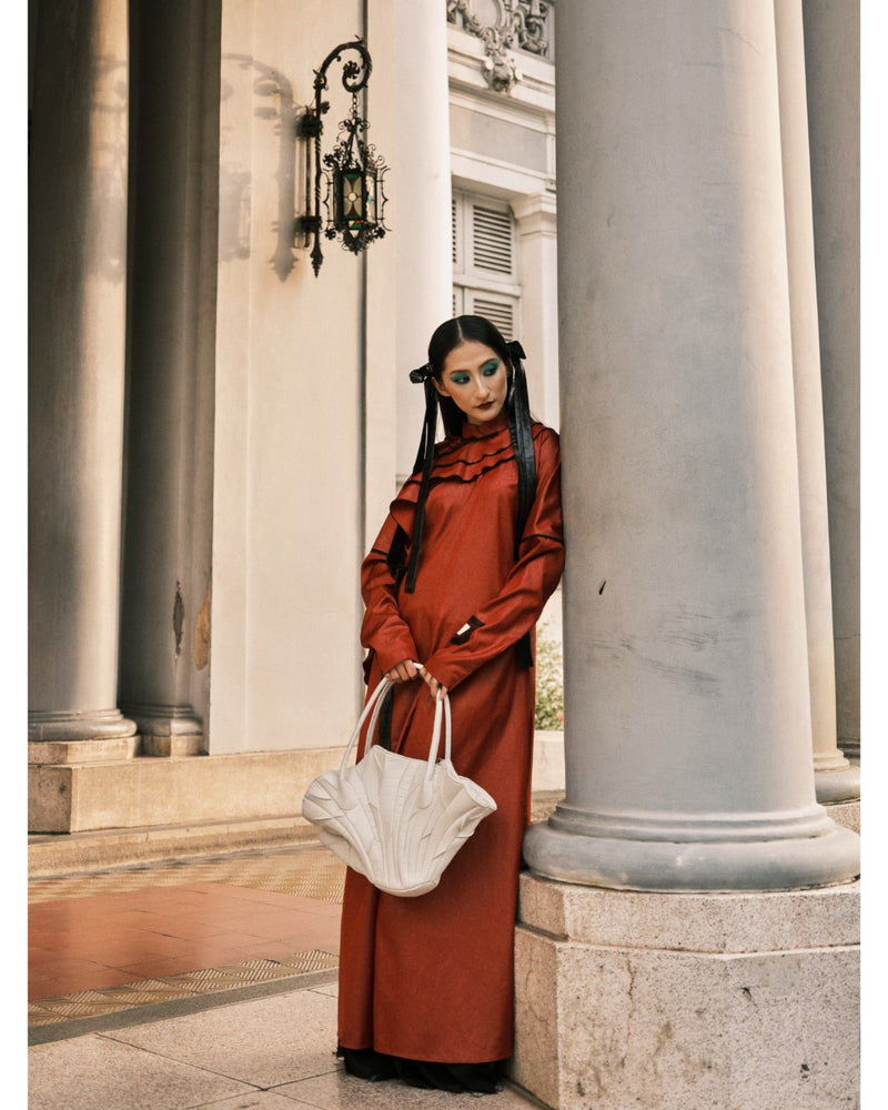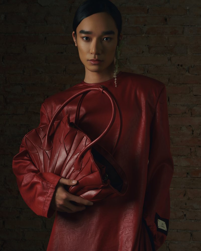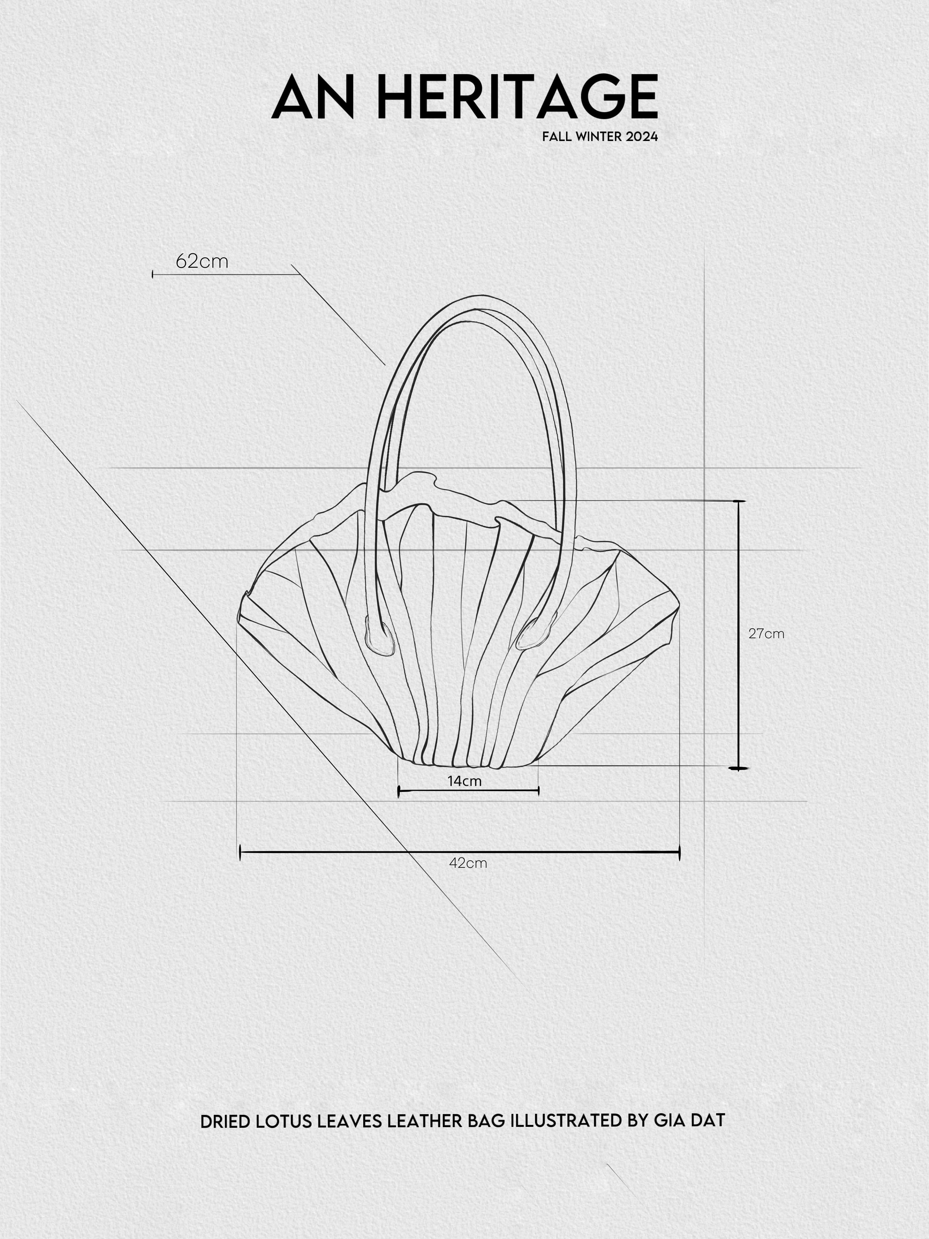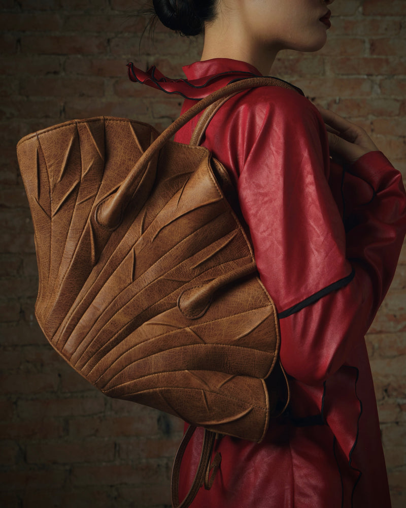 - The Dried Lotus Leaves Leather Bag is inspired by Lotus leaves that bend and sway during the windy season. The brown color and the lotus leaves shape highlight the design.