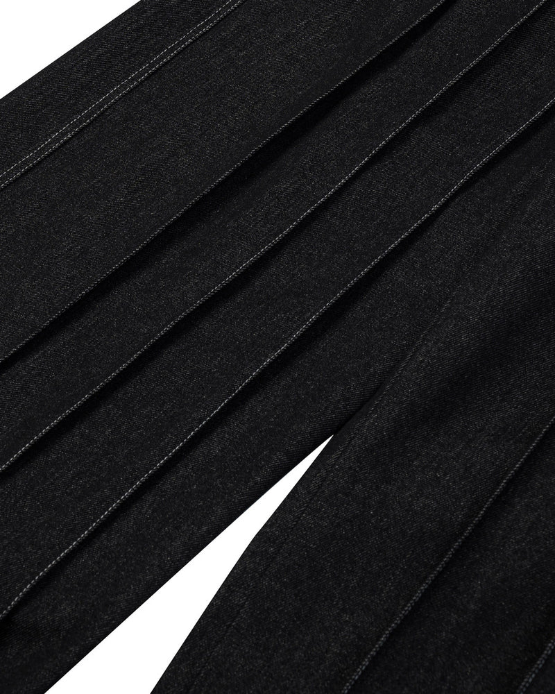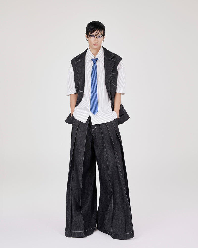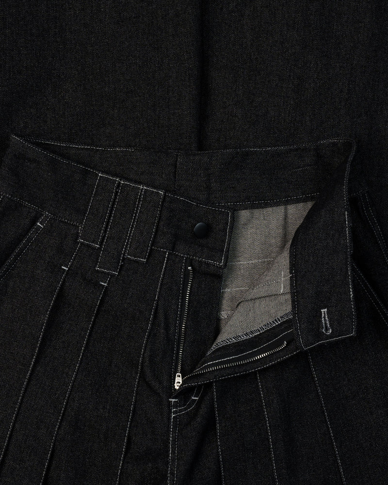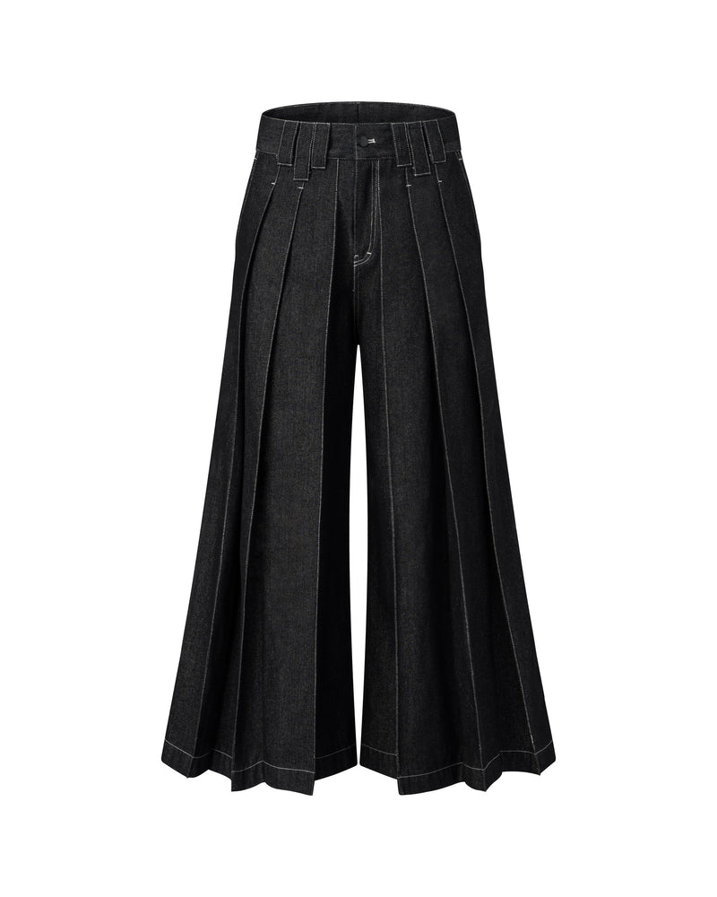 - These wide-leg denim pants feature handcrafted, symmetrical pleats on both sides, with prominent topstitching running down the length of the legs.