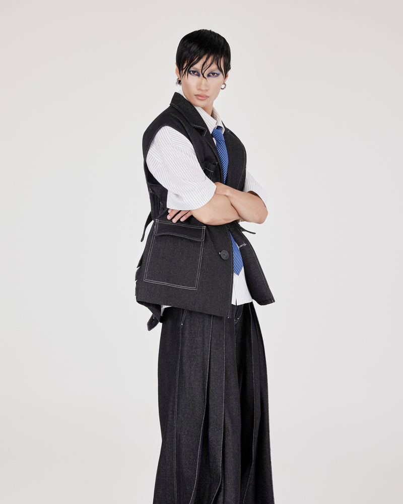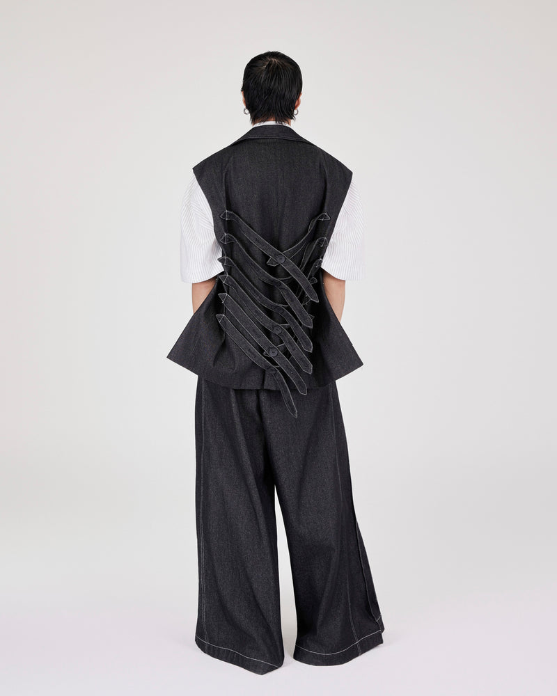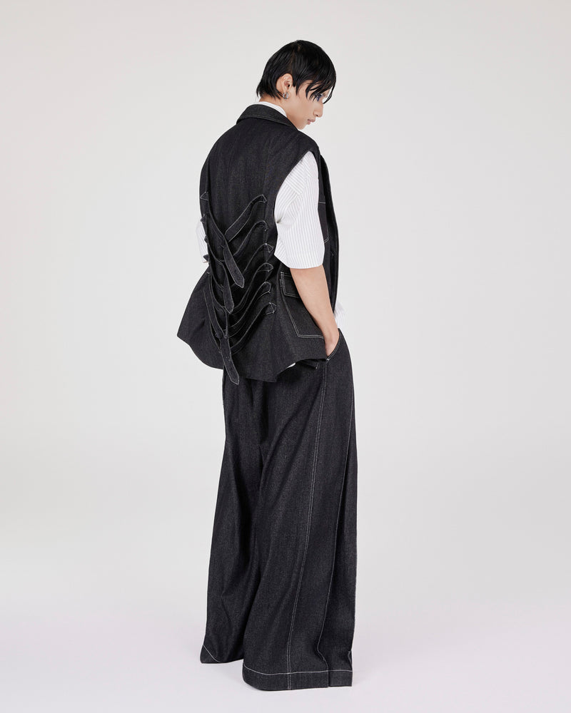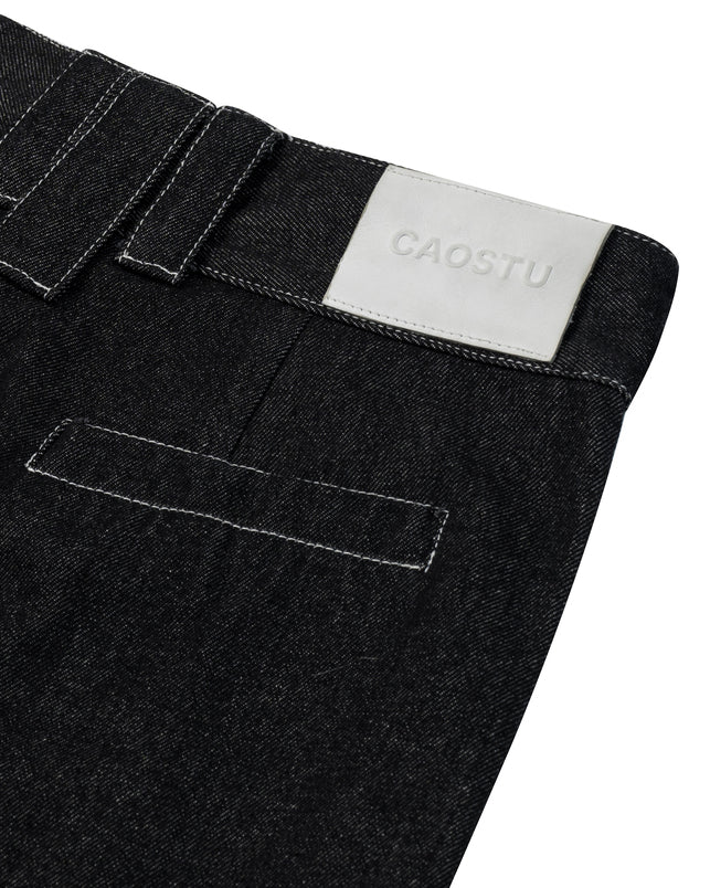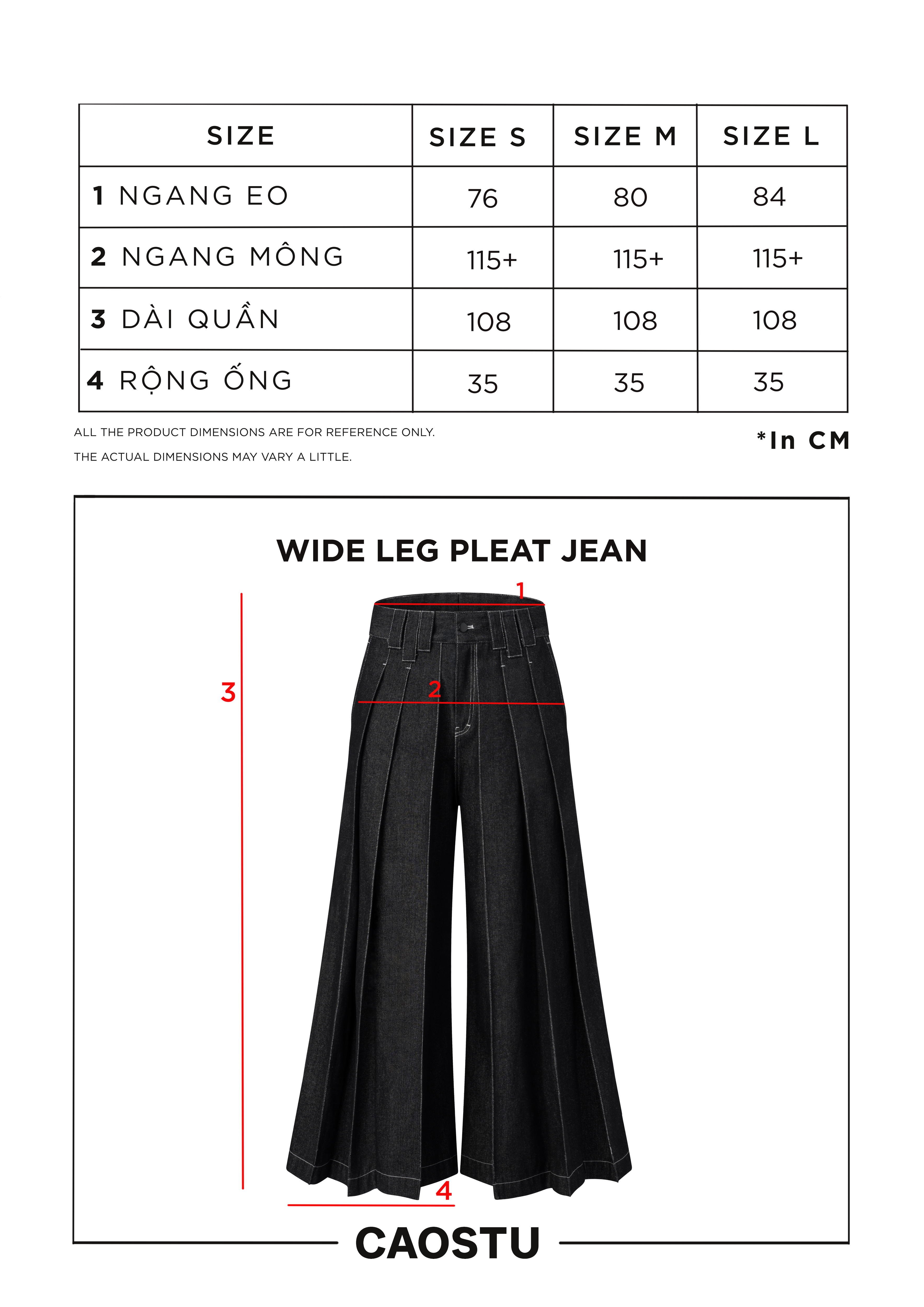 - These wide-leg denim pants feature handcrafted, symmetrical pleats on both sides, with prominent topstitching running down the length of the legs.