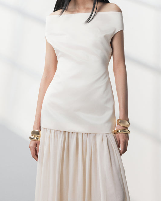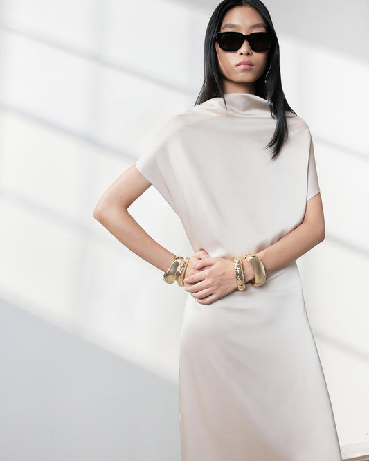 FORTYTHREE's Summer 2025 collection tells the story of a soul in motion - awakening, centering, and arriving with quiet power. From softness to strength, from inward to outward. FORTYTHREE invites wearers to move fluidly through silken drapes and sheer layers. Balance is found in contrast-sharp tailoring softened by flowing lines-while contemplation is echoed in neutral tones that invite stillness. Each silhouette carries a sense of elegance: refined, effortless, and weightless. Yet beneath the softness lies the unmistakable boldness of FORTYTHREE: confident cuts, purposeful details, and a presence that doesn't need to be loud to be felt.