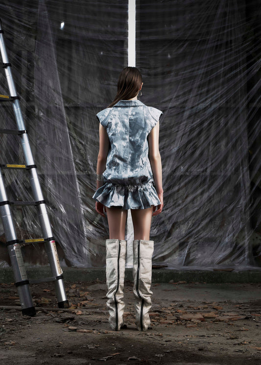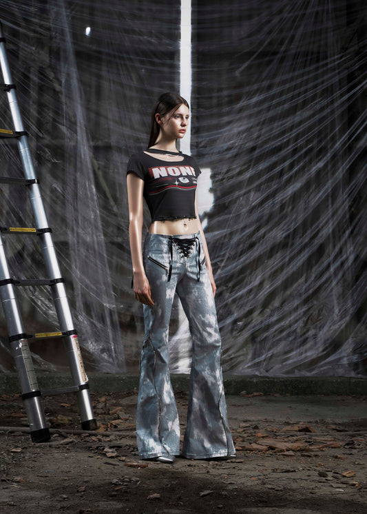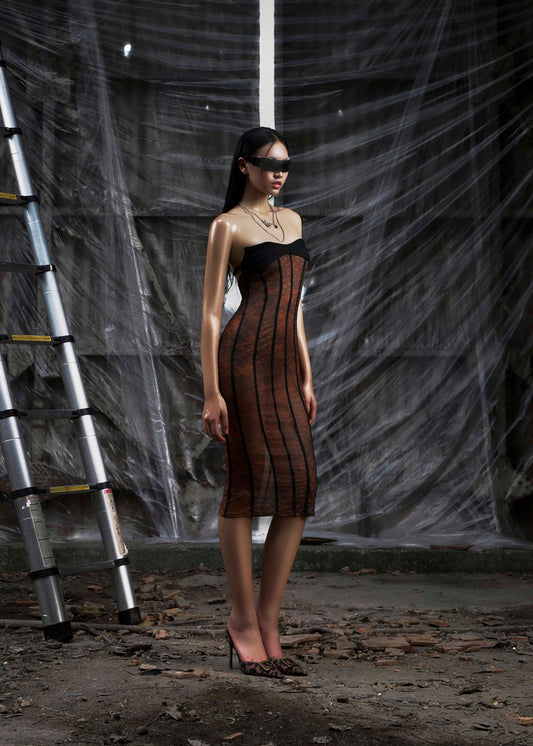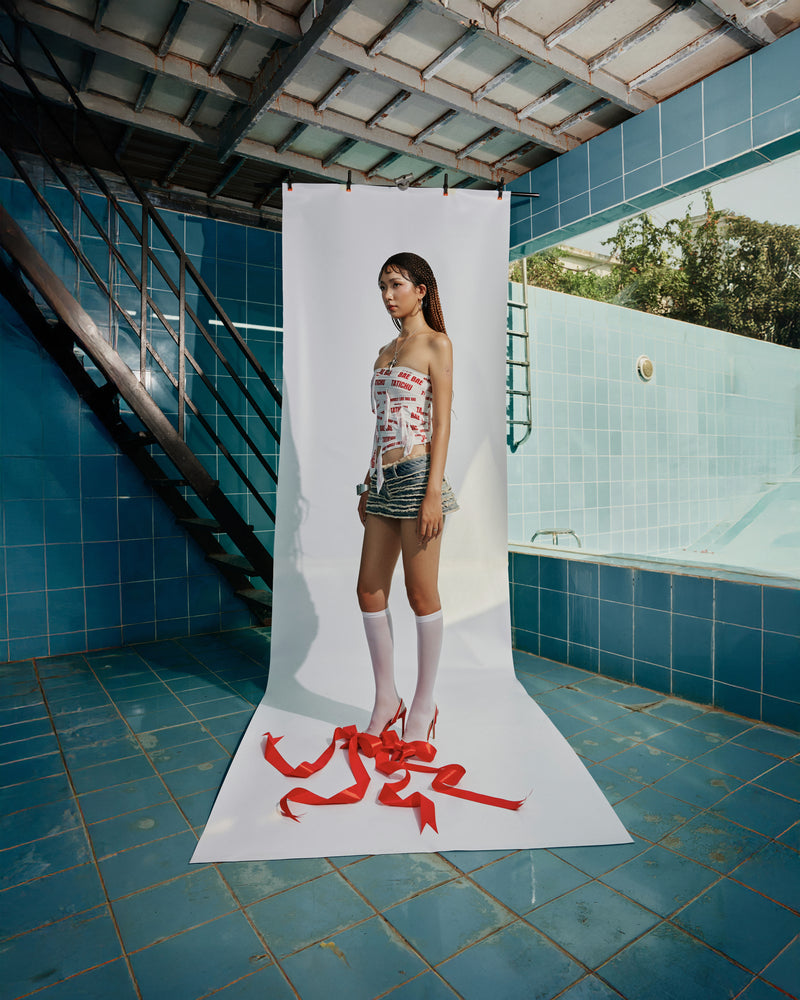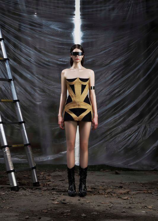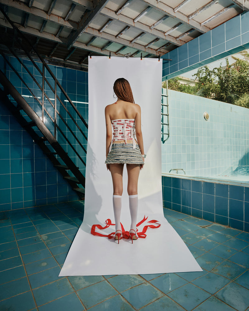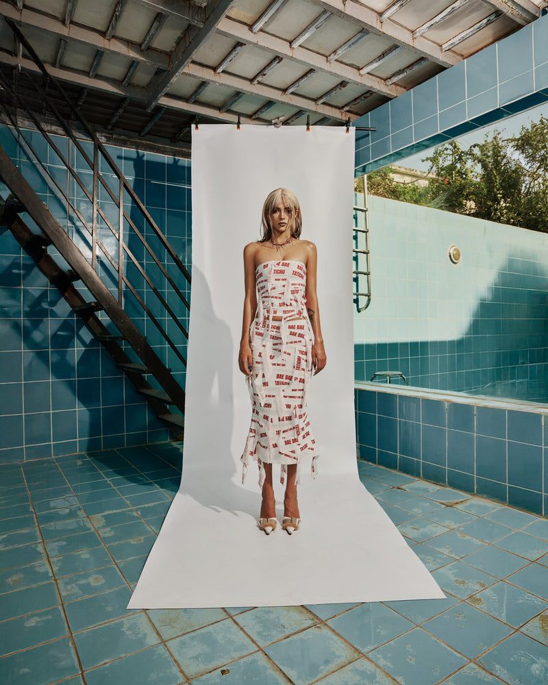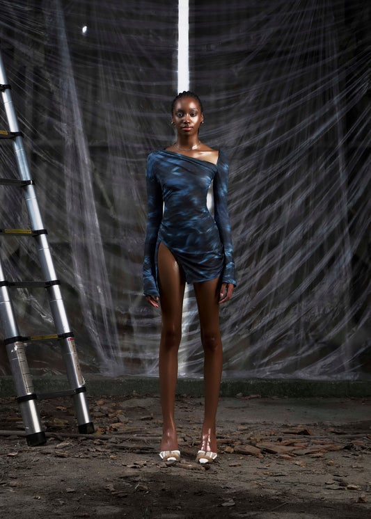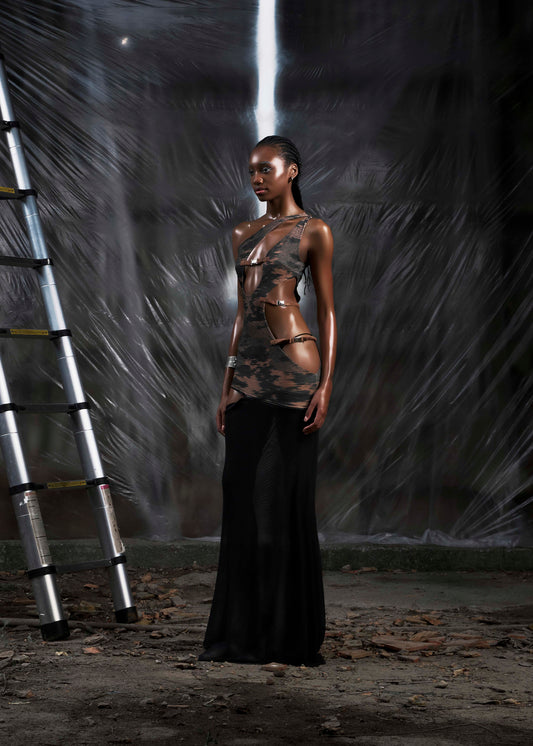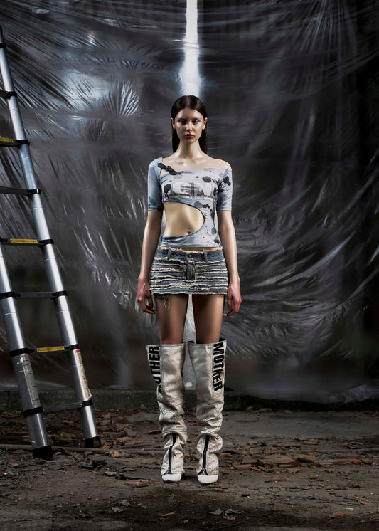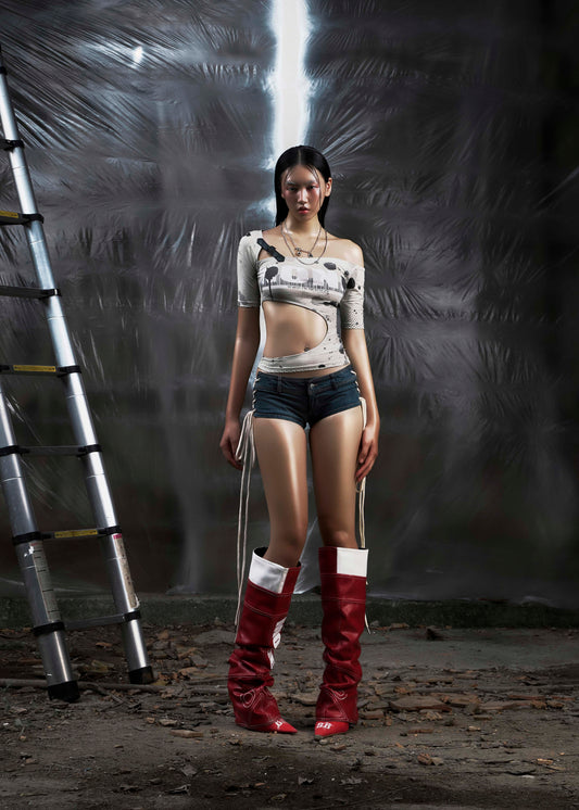 - 细节:露肩上衣,包裹着重叠的印花面料细节