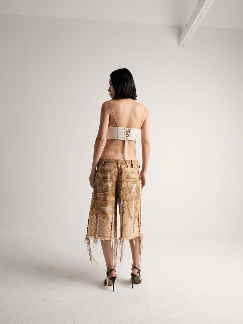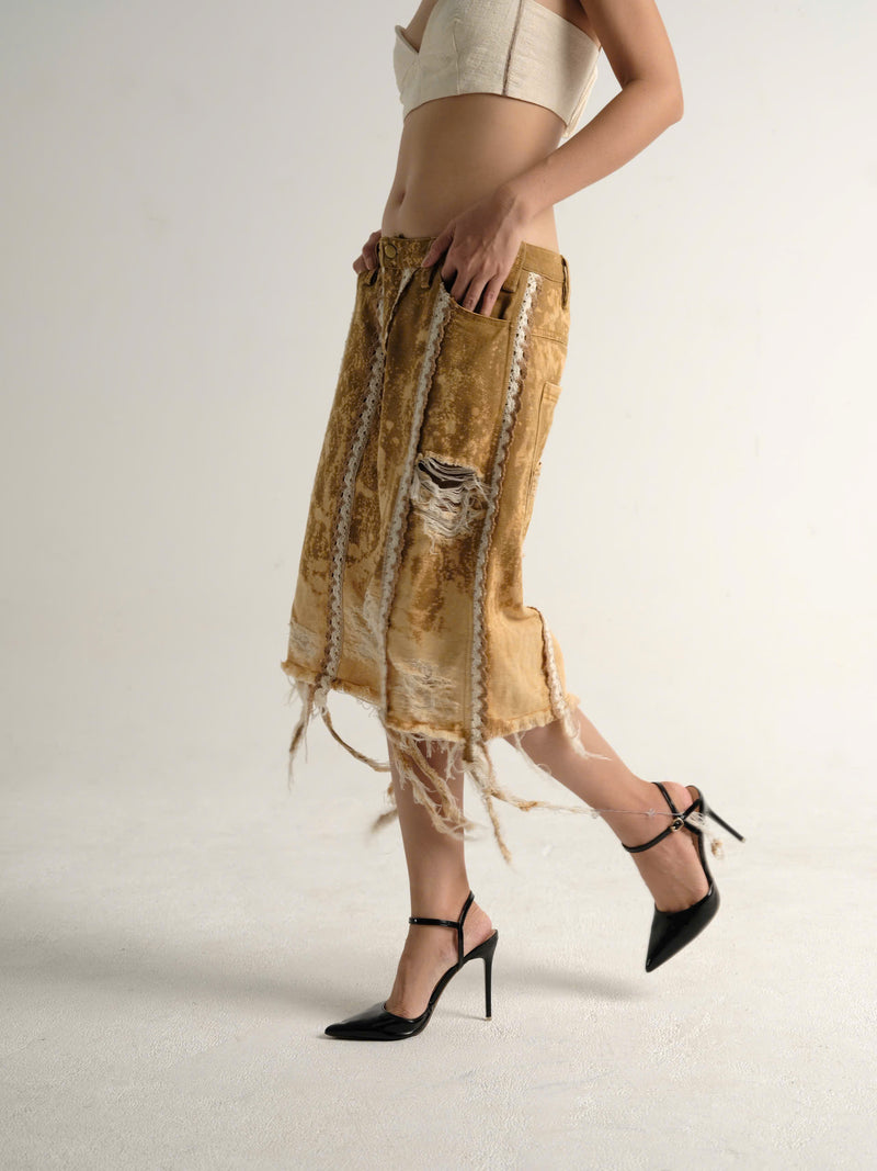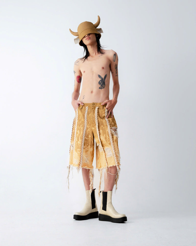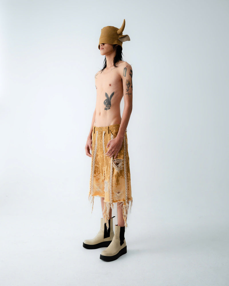 - Chenh Venh 裤裤采用手工牛仔布搭配精致蕾丝设计而成,让人联想到肥沃的冲积平原和悠闲吃草的水牛。