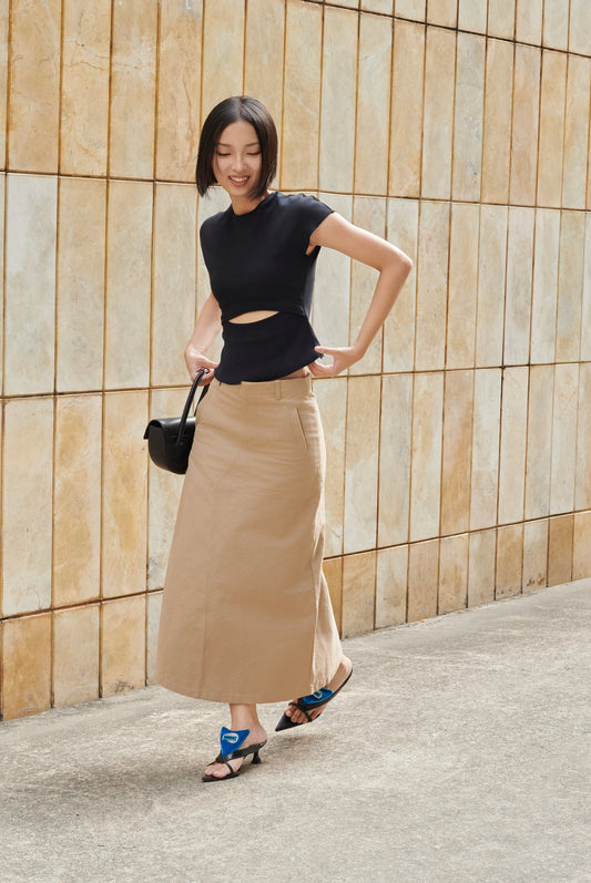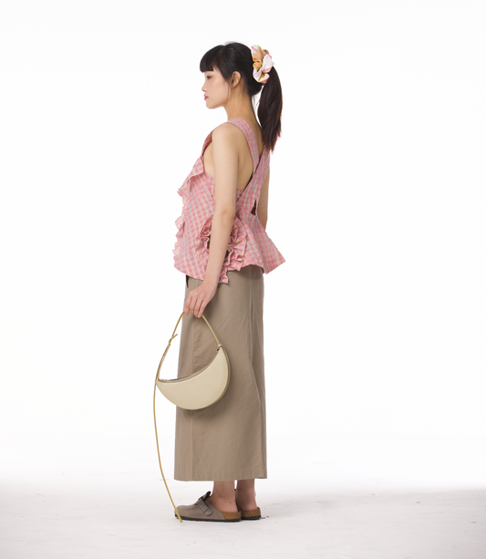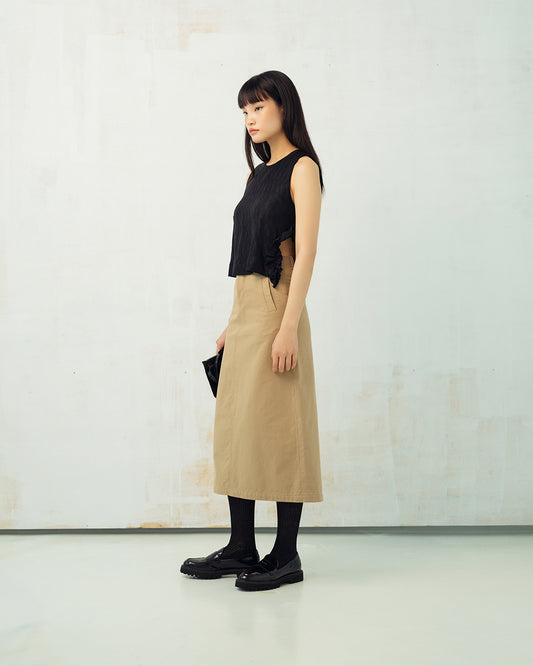 Detail: A-line midi dress with round neck, sleeveless, elasticized ruffles