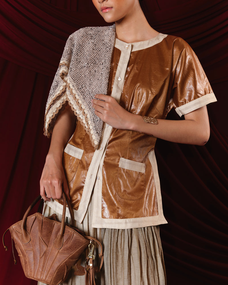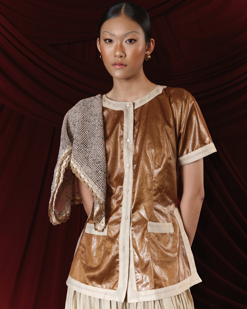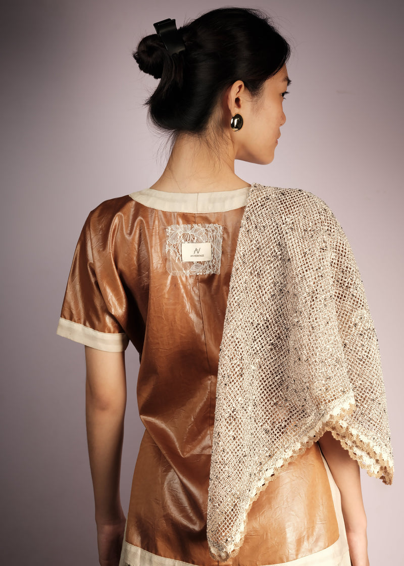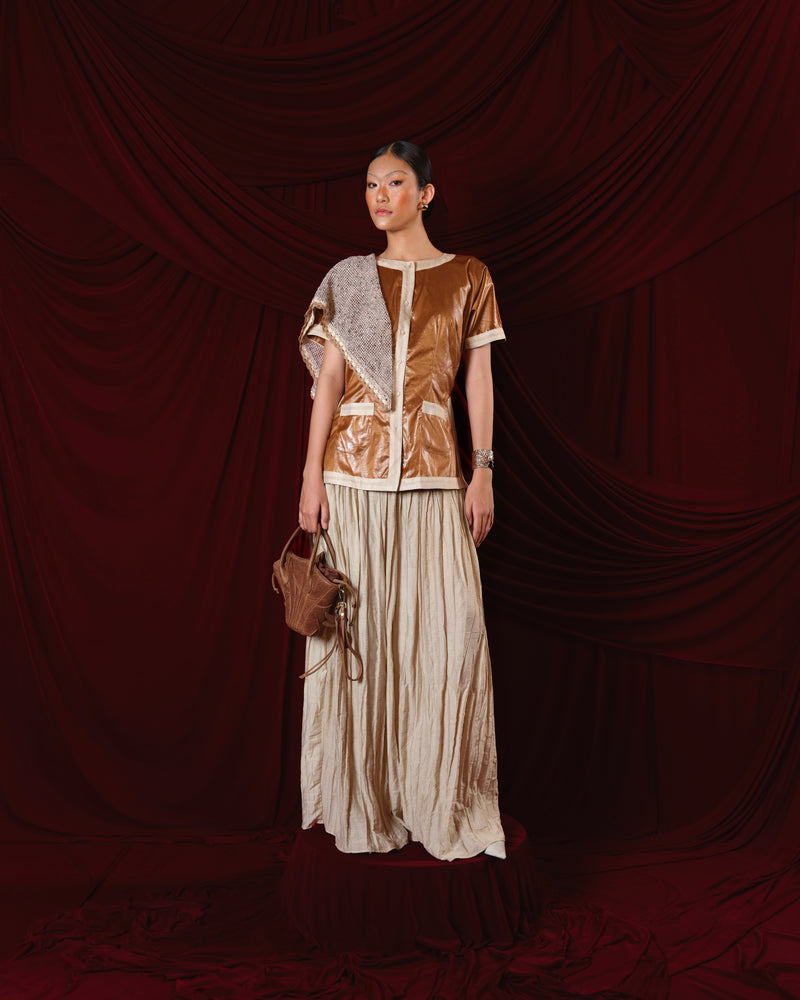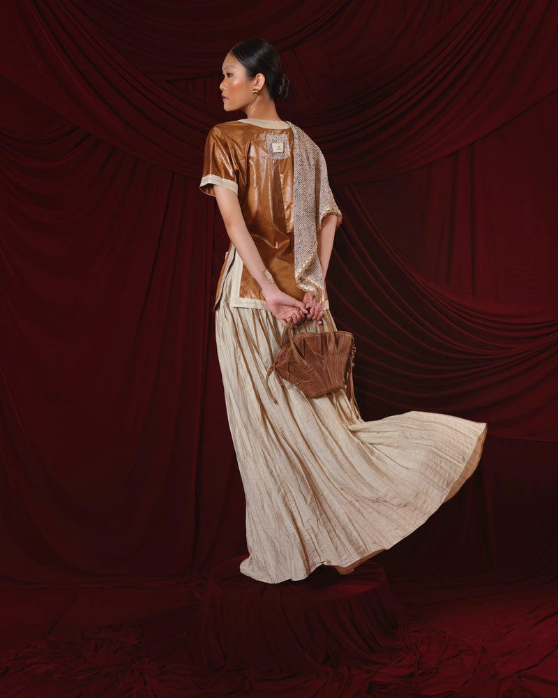 - Drawing inspiration from the graceful lines of the traditional Southern áo bà ba, this design captures the soul and spirit of a fertile alluvial land. Rendered in the signature earthy brown of the soil, the garment stands as a symbol of resilience and diligence, qualities deeply rooted in the lives of the region’s farmers.