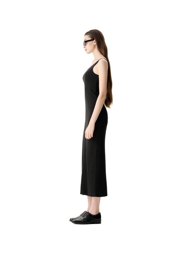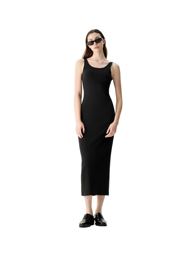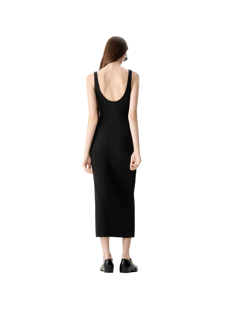 无袖低背中长连衣裙
