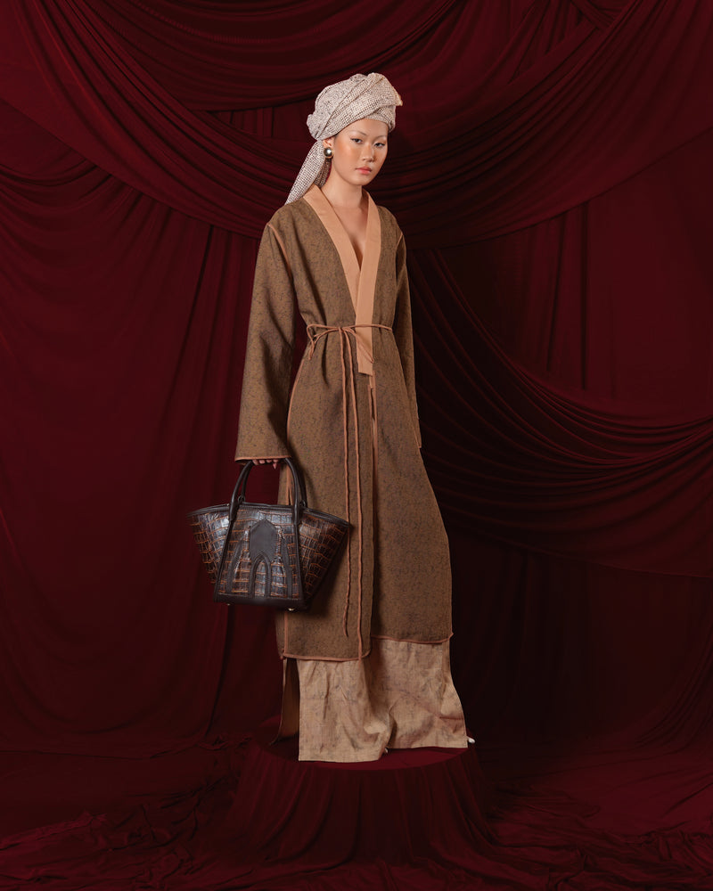 - The Cổ Chiên River winds around the old brick kilns, shimmering like a ribbon woven from sunlight, embracing lush alluvial banks. Its serene beauty is captured in the design through a relaxed silhouette and colors that evoke the peaceful charm of the countryside.