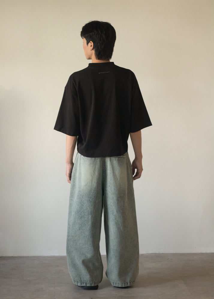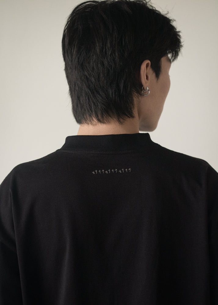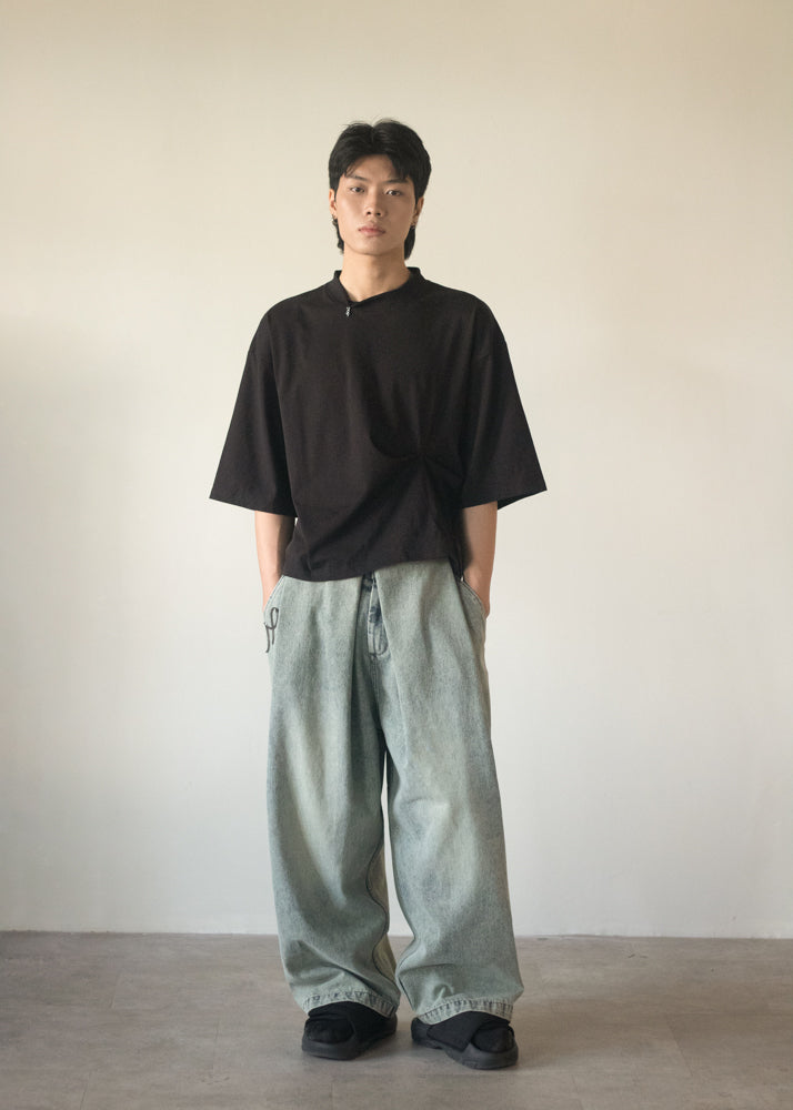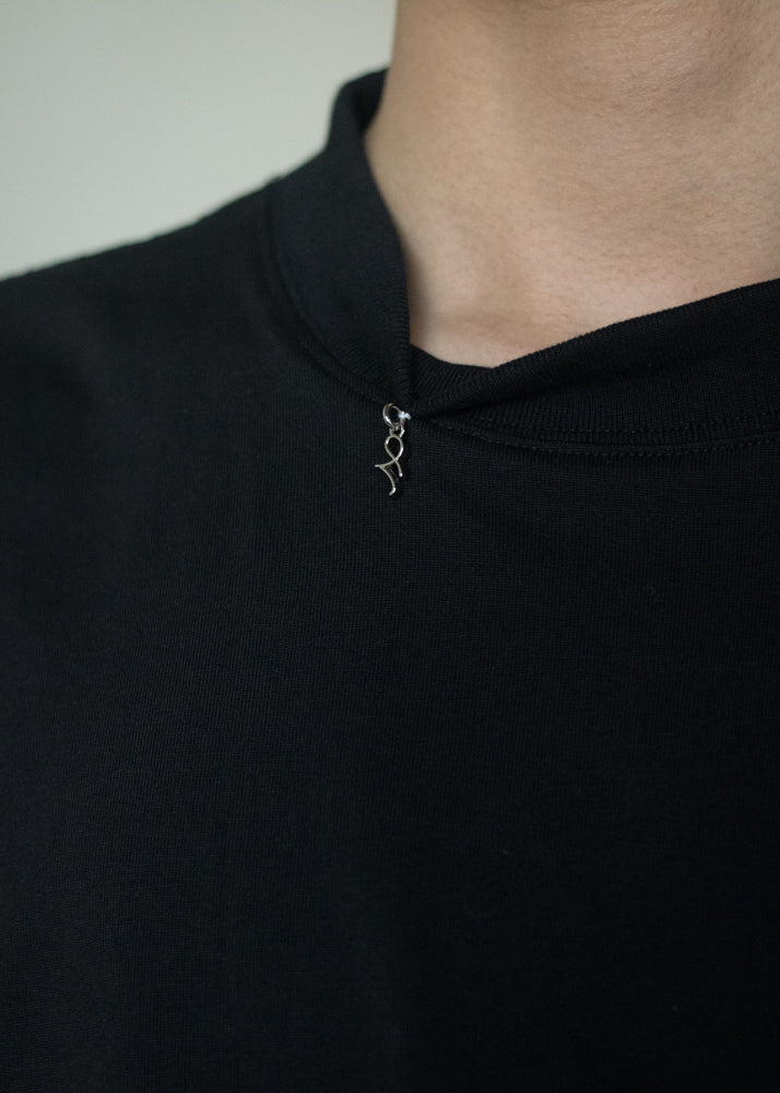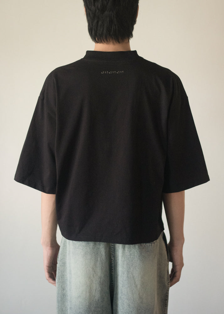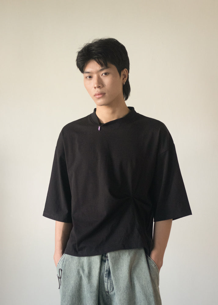 宽松T恤,风格独特的翻领,缝制金属标签。正面饰有褶饰,背面饰有丝网印刷徽标。