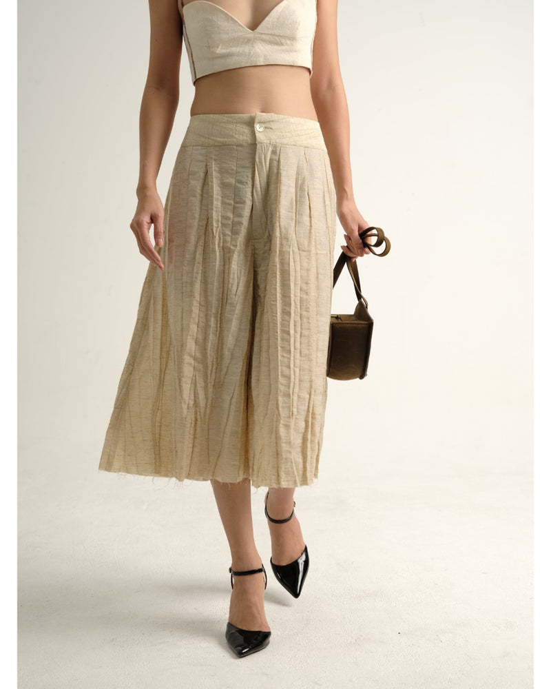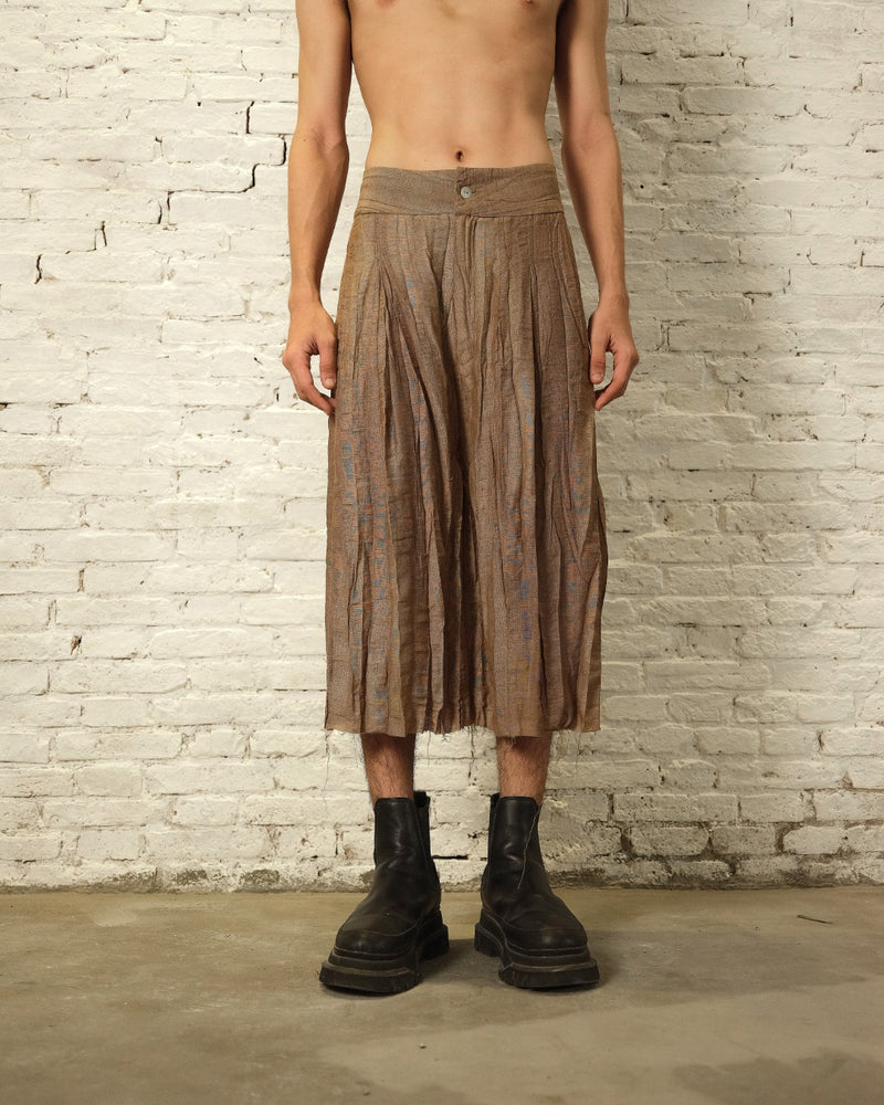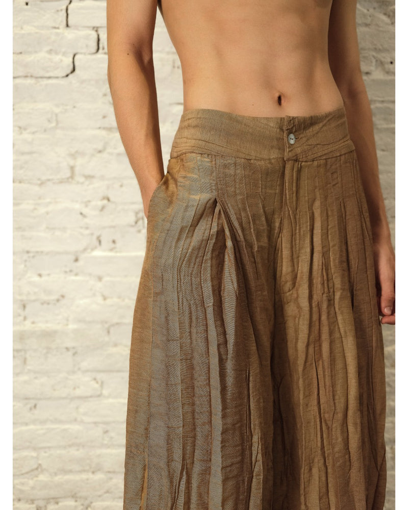 - Chay Dong 裤裤采用亚麻面料制成,具有波浪形编织图案,结合褶皱泡泡纱和宽松舒适的版型,营造出凶猛的洪水季节的画面。