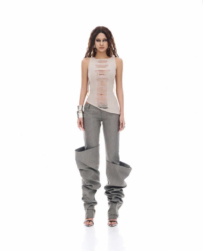A bold, body-hugging tank top featuring an edgy distressed cut-out design down the front.